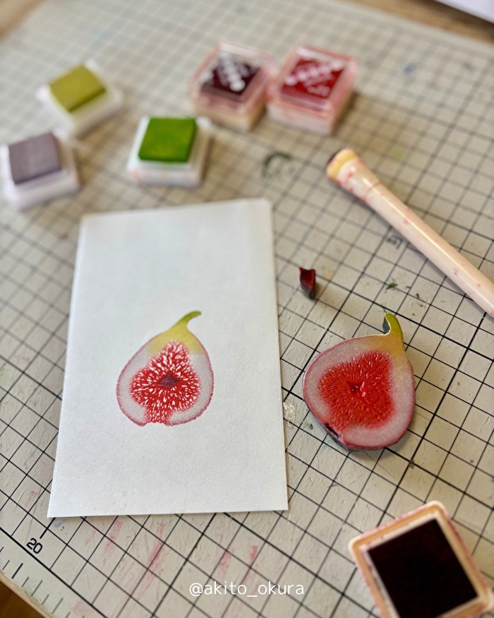 消しゴム版にグラテーションを描くようにインクを載せて和紙に押すと、ボタニカルないちじくの実が現れるというものです。