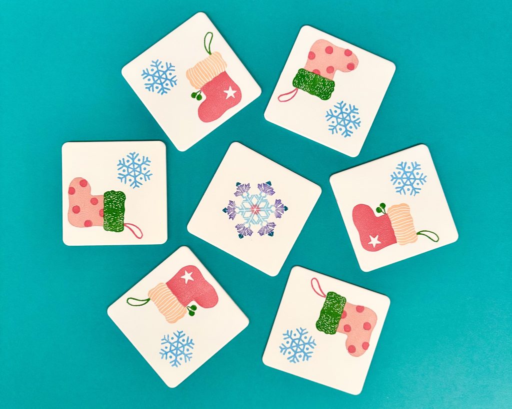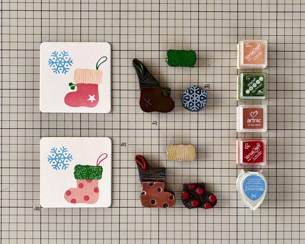 大倉が制作した2種類の消しゴム版画の中からお好きなデザインを選んでいただき、用意した消しゴムはんこにインクを付けてペーパーコースターに押します。複数の版を組み合わて、可愛いクリスマスブーツの完成です。彫る工程はありません。完成した作品はお持ち帰りいただけます。